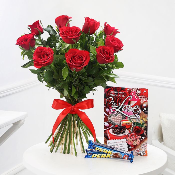 This hamper contains an awesome bunch of 10 red roses, 2 bars of Perk chocolates, and a love card for the special one in your life.