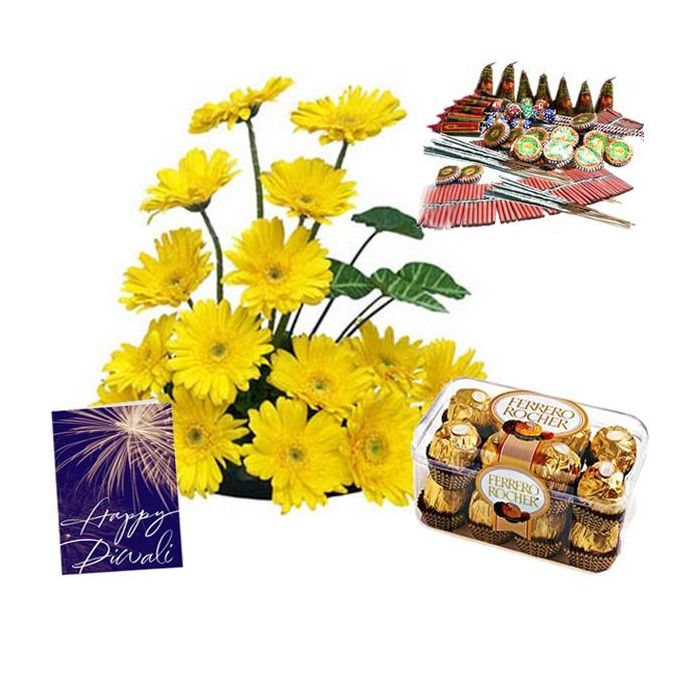Celebrate this diwali with your near and dear ones. Gift this Naughtiest Diwali Wishes Combo to your beloved and make this diwali special. This combo has Chocolate box 200 grams, 20 yellow Gerberas and fire crackers along with one diwali greeting card.