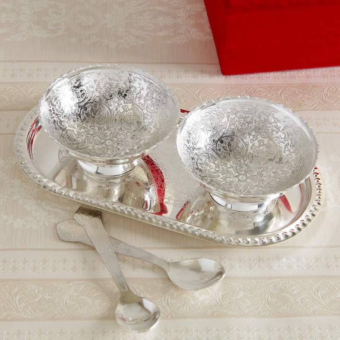 A very special Silver set of bowl, spoon with serving tray. Give this special gift on diwali to your loved ones and make the wonderful celebration with your family and friends. A best combination of silver & carving trading design that comprises 2 bowls, 2 spoon with one serving plate.