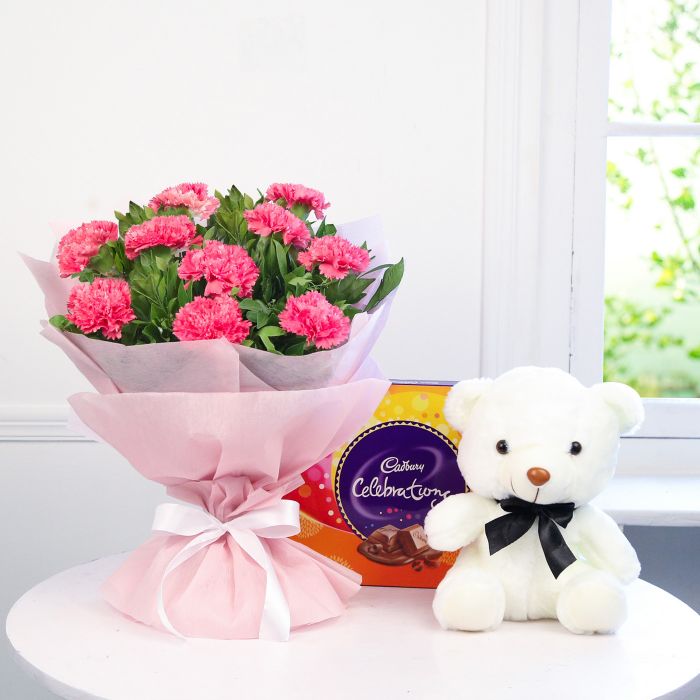 A combo of the teddy bear with carnations and dairy milk celebration chocolates will delight your adore. This combo consists red carnations a teddy and a cadbury celebration chocolate.