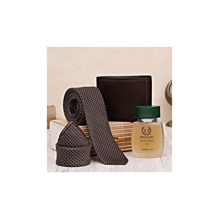 Buy Denver with tie pocket square online and present to your loved ones. This gift contains one Perfume, one wallet, and a tie.