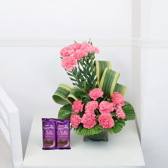 Lovely Carnations In A Glass Vase with Cadbury Silk