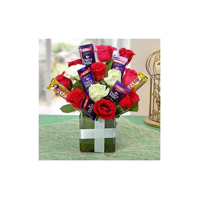 A lovely combination of mix roses with chocolates specially decorated in a square shaped glass vase. Is a perfect gift for your dearest and nearest one.