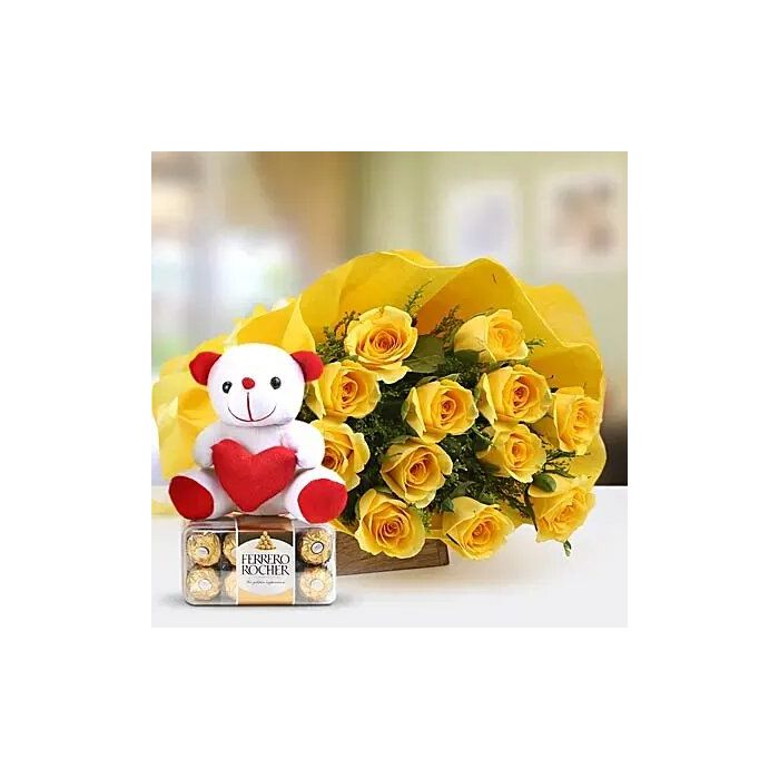 Yellow Roses and Small Teddy with Ferrero Rocher Chocolate