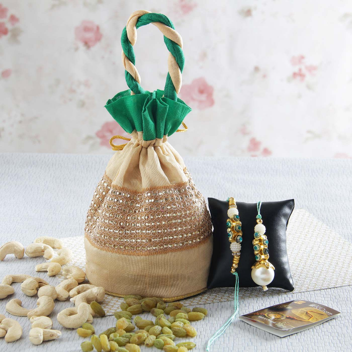 Bhaiya Bhabhi Rakhi With Potli Bag and Kaju and Raisin