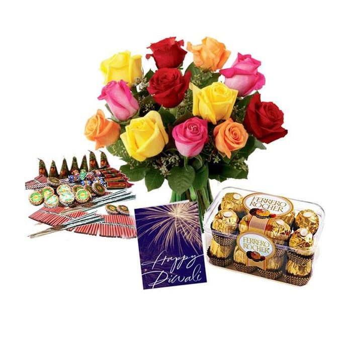 Send well wishes to your loved ones, SendGifts brings you a special diwali gift combo that having Bunch of 12 mix Roses, 200 grams chocolate box and Diwali Greeting card along with fire crackers.