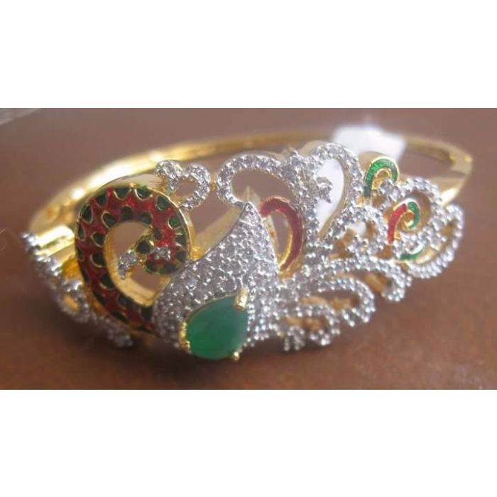 This is a unique Golden coloured ring with a peacock design. Red and green opposite colour used with white diamonds. It looks different.