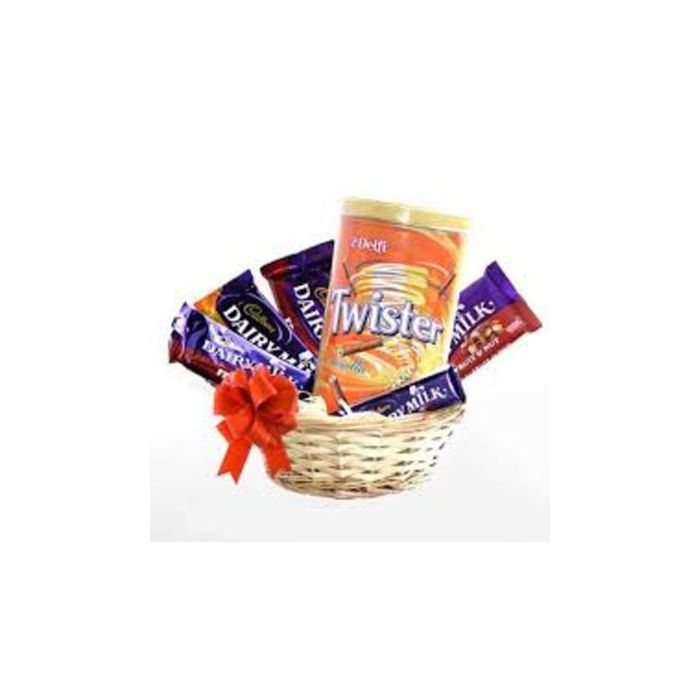 The Hamper includes: Twister Vanilla Stick 320gm, Dairy Milk fruit N nut chocolates (4 Pieces, 42gm each) in a basket with ribbon bow