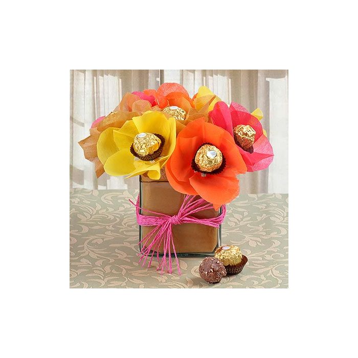 Celebrate your favorite occasion with a beautiful gifting arrangement. This beautiful gift made with beautiful Ferrero Rocher Chocolates with Decorated in beautiful papers and arranged in a square glass vase.