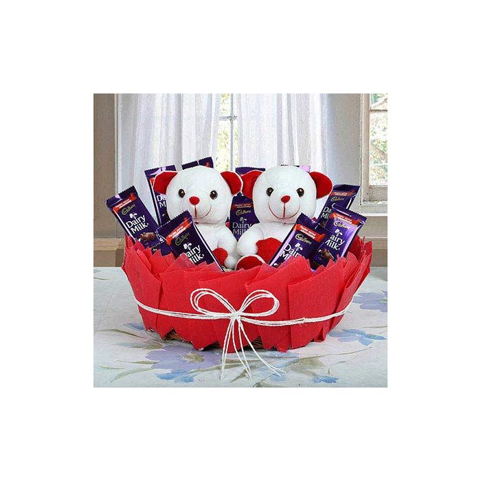 Gift this beautiful gift to your loved one on her special day, This beautiful gift arrangement made with a couple of cute Teddy Bears with 10 Cadbury Dairy Milk Chocolates.