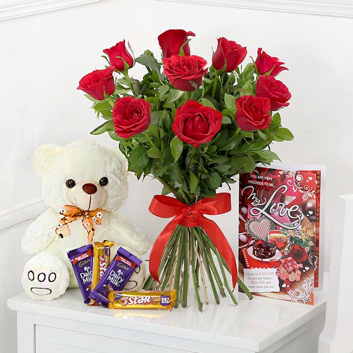 A large collection of special gifts is surely impressed your special one anyone can impress buy gifting this combo of red roses with a teddy bear and dairy milk and five star chocolates.