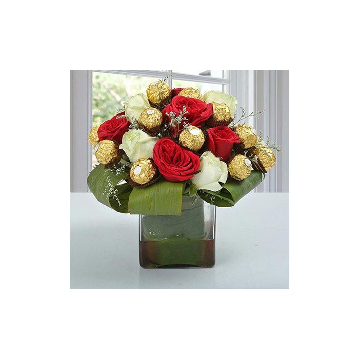 When words are not sufficient to express your love gift this special gift and impress your loved one. This awesome gift is made with Ferrero Rocher and red roses arranged in a square glass vase.