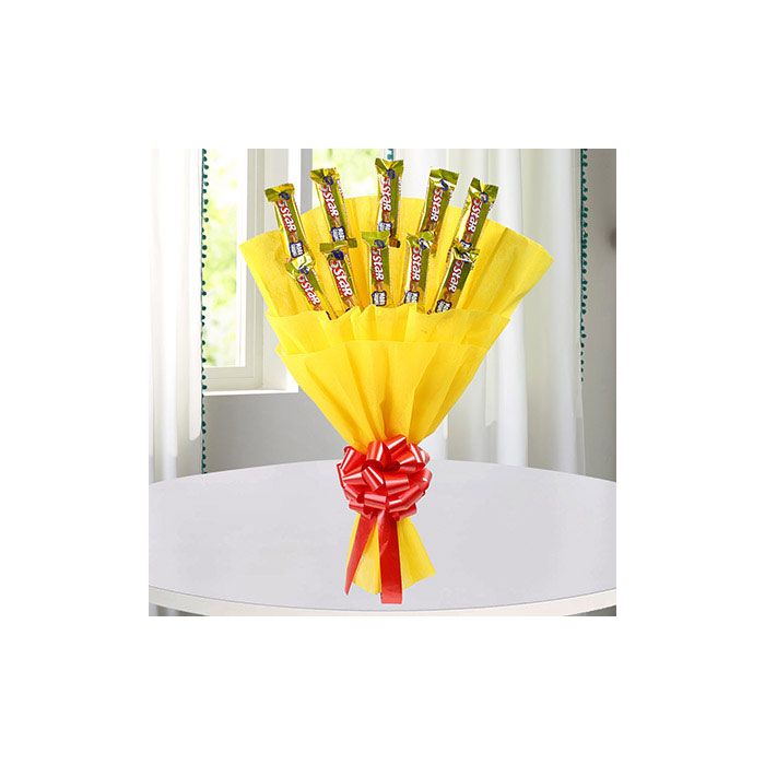 A beautiful arrangement of Five-star chocolates in a beautiful bouquet, This bouquet wrapped in a beautiful yellow paper and the Red ribbon looks so awesome.