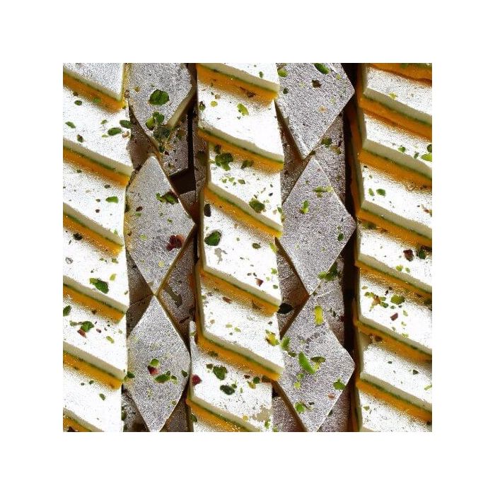 The name itself suggests its speciality, triangles are made with the goodness of kaju and pista mix with real kesar substance, with the right amount of sweetness. It will be neatly decorated with almond seeds. Which truly attracts children most by its fine shape and look. So order this delicious treat of 250 gms from SendGifts Ahmedabad for your family to make them happy on this Diwali.