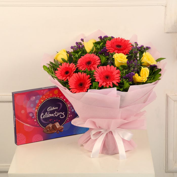 Mix Colored Flower Bouquet With Cadbury Celebrations