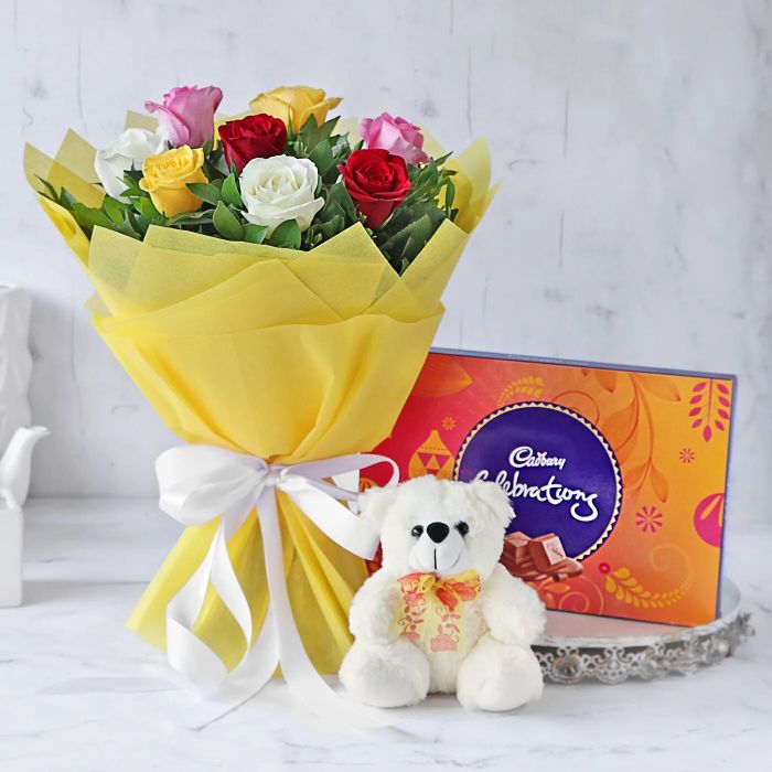 Mix Roses with Cadbury Celebrations And Teddy Bear