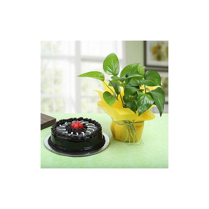 The awesome gifting combination of black forest cake with money plant. Delicious black forest cake is the best treat for any cake lover, There is some beautiful magical spongy layer of chocolate present on It And a beautiful money plant comes in this gift.