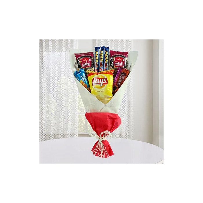 This lovely bouquet contains the delicious and multiple flavors of snacks and chocolates. This bouquet contains Cadbury Perk Chocolates, Lays Potato Chis, Britannia Bourbon, Good Day Butter Cookies, Haldiram's Classic Salted Peanuts.