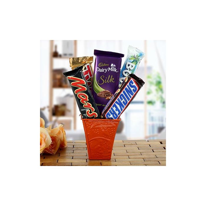 A beautiful arrangement of chocolates in a bouquet, This bouquet is made with Mars Chocolate, Snickers Chocolate, Twix Chocolate, Bounty Chocolate, Dairy Milk Silk Chocolate.