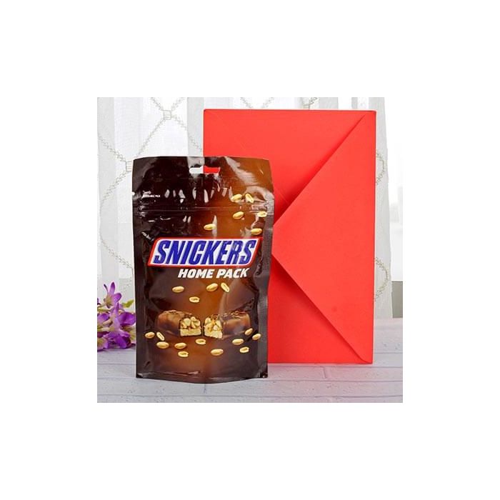 Pick the best combo from SendGifts, A perfect festive combo of the yummy delicious chocolates from the Snikers and Diwali Greetings Card.