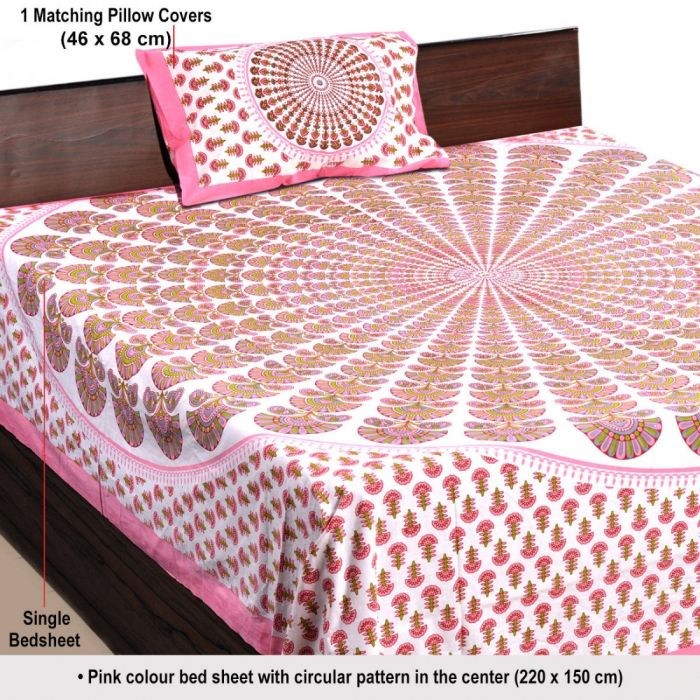 Pink Colour Block Printed Cotton Bedsheet