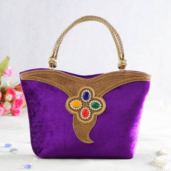 Are you looking for chic, trendy bag for your beloved? So here we present very comfortable and stylish bag for Women. You will get this classy purple colored velvet bag in affordable price to the market, which having golden zardozi work and the metal handle make the bag more chic and more comfortable to carry. You can add your all essentials in this bag.