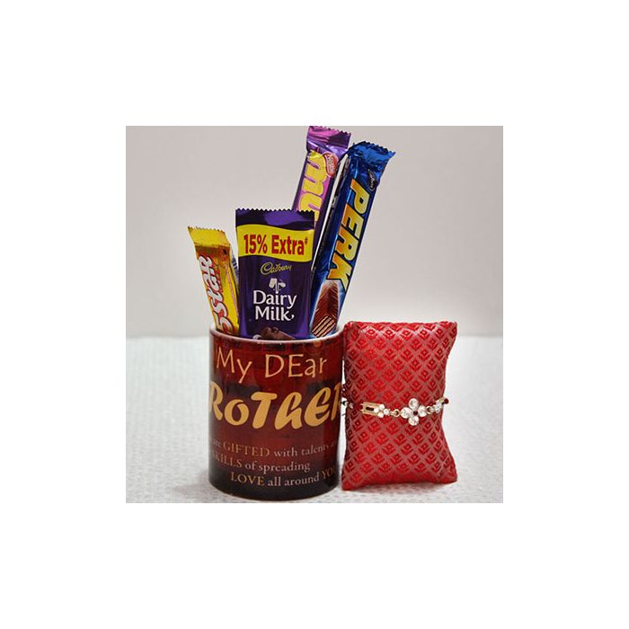Send to your sweet brother something unique - Rakhi combo with Chocolate and coffee mug.