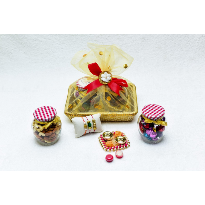 Decorative basket, 2 jars, chocolates (10pcs), Dryfruits (170gm), one rakhi, one pair of kum kum chawal with plate.