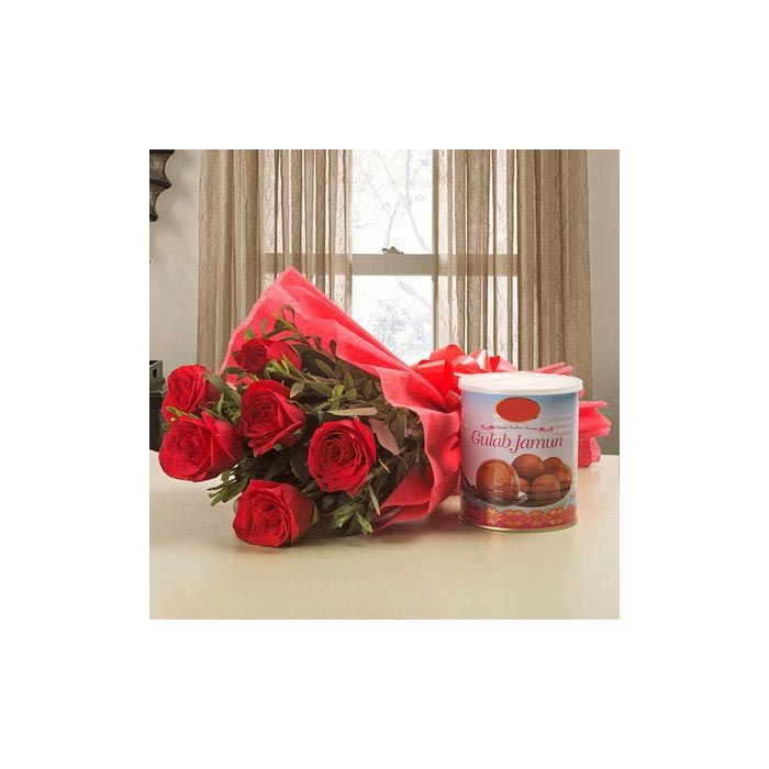 Blooming a special bunch with a special arrangement in a red paper wrapped with 1 kg gulab jamun will add special delight flavor.