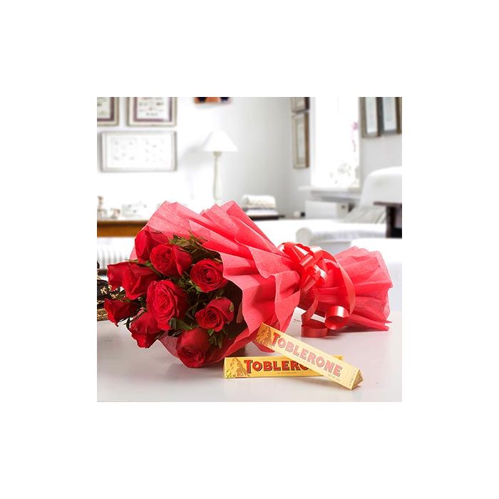 Gift special red roses with the special Toblerone chocolates and win your special one heart. This bunch consists of 10 red roses with 2 Toblerone chocolates.