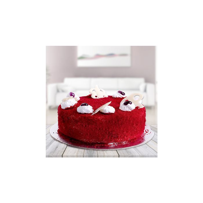 Romantic red velvet cake with awesome looking white cream spread over it. this cake is perfect delight your loved one for birthday or any special occasion.
