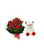 This fantastic pack looks perfect as a gift for your dear ones for our trendy occasions. A stunning and exotic assorted coloured roses along with a charming teddy bear in a basket attracts one with its beauty. Variety of flowers spread a unique fragrant bloom and Huggable teddy provides a soft and furry touch.