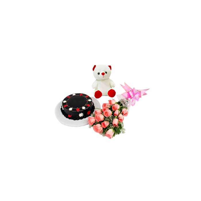 Surprise your loved ones by sending this innovative fusion pack of gift which contains beautiful light pink roses, a sweetest teddy bear and an eye catching delicious round chocolate flavour cake. The cake adds its unique charm in this gorgeous combination. And tempting flowers offer a fresh fragrance wrapped in cellophane with ribbon bow. The expressions must be noticeable while this gift will be opened on lovely festivals.