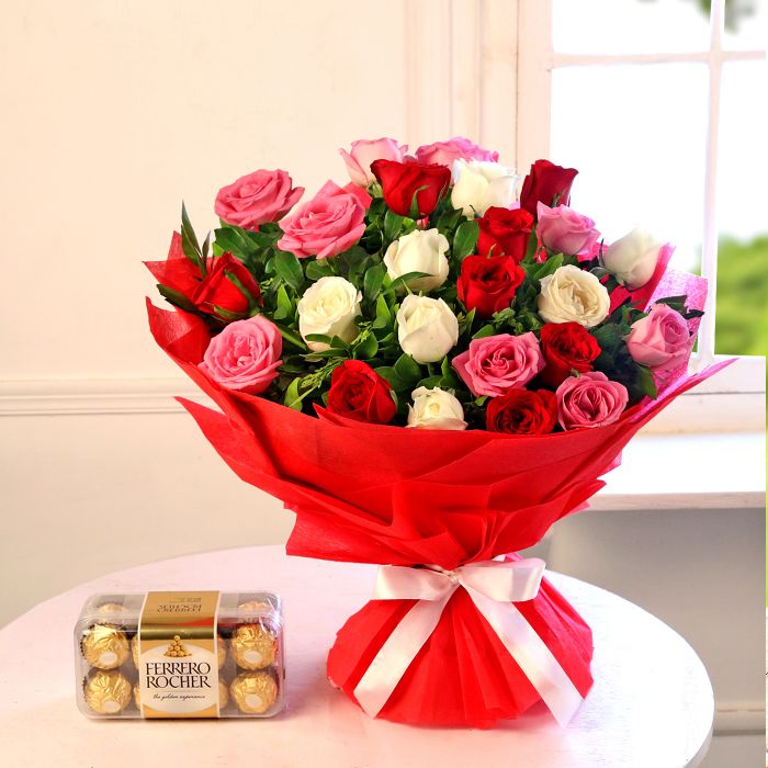 Round Bouquet Of Mixed Flowers With 16pc Ferrero Rocher
