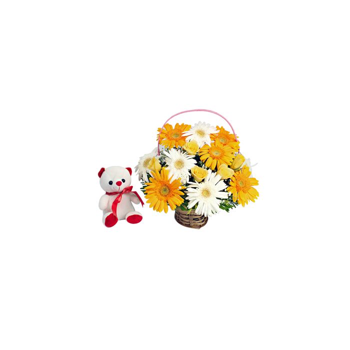 Make your beloved one feel more special and cheery by sending your love in a form of stylish gift for their special birthdays or any other carnival. This pack looks perfect, because it is having a captivating teddy bear and a trendy flower bunch of yellow and white beautiful gerberas along with yellow roses organized in a pretty basket.